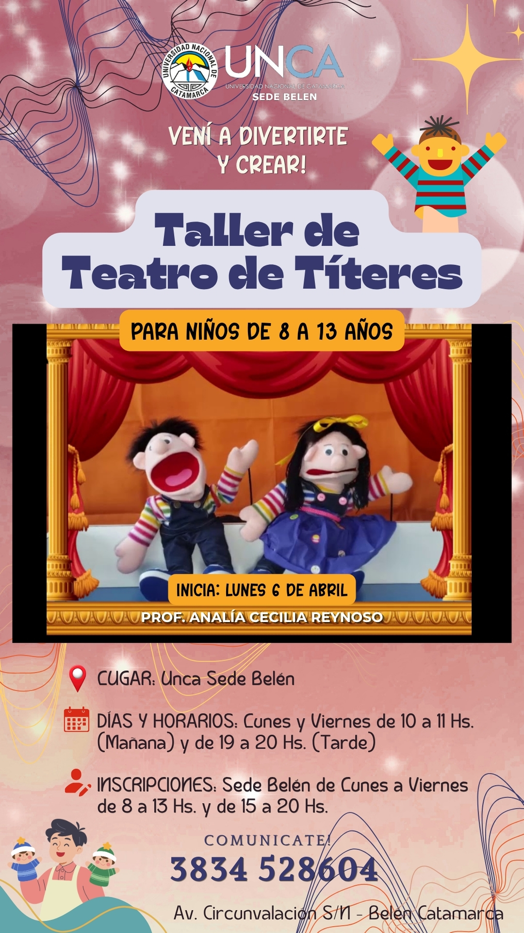 ΒΏTenΓ©s entre 8 y 13 aΓ±os? Β‘Este taller es para vos! Sumate al Taller de Teatro de TΓ­teres en la UNCA Sede BelΓ©n y descubrΓ­ el mΓ‘gico mundo de la actuaciΓ³n y la creaciΓ³n.