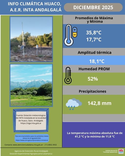 Diciembre 2025 se caracterizó por altas temperaturas y precipitaciones muy superiores a lo habitual en el territorio. Las temperaturas máximas se mantuvieron elevadas, con registros superiores a 40 °C, mientras que las mínimas fueron templadas, manteniendo una alta amplitud térmica típica del valle.