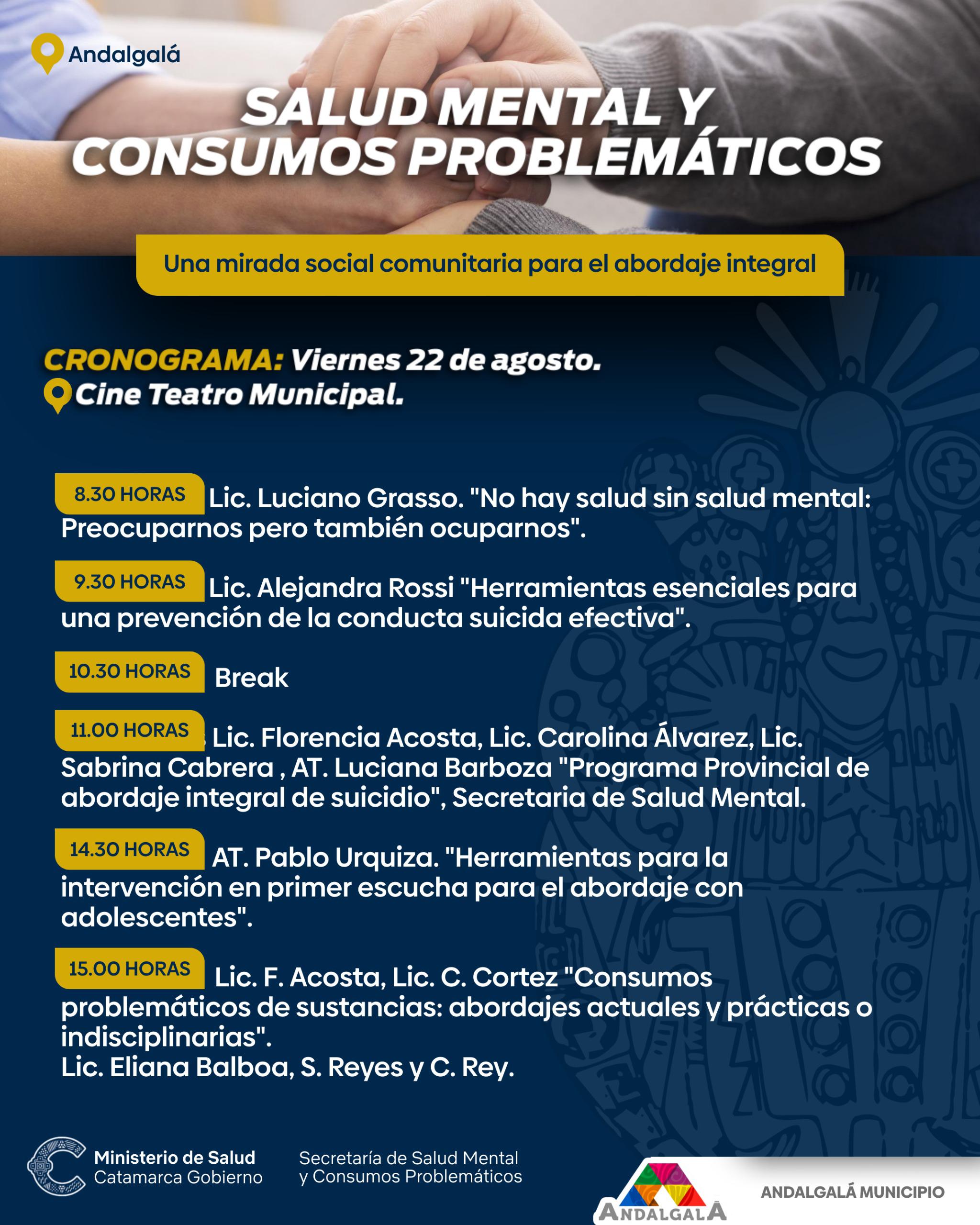 Mañana viernes 22 de agosto, en la ciudad de Andalgalá tendrá lugar la primera jornada de Salud Mental y consumos problemáticos, actividad organizada por la municipalidad de Andalgalá y contara con el acompañamiento del Ministerio de Salud de Catamarca, Secretaria de Salud Mental y Consumos Problemáticos.