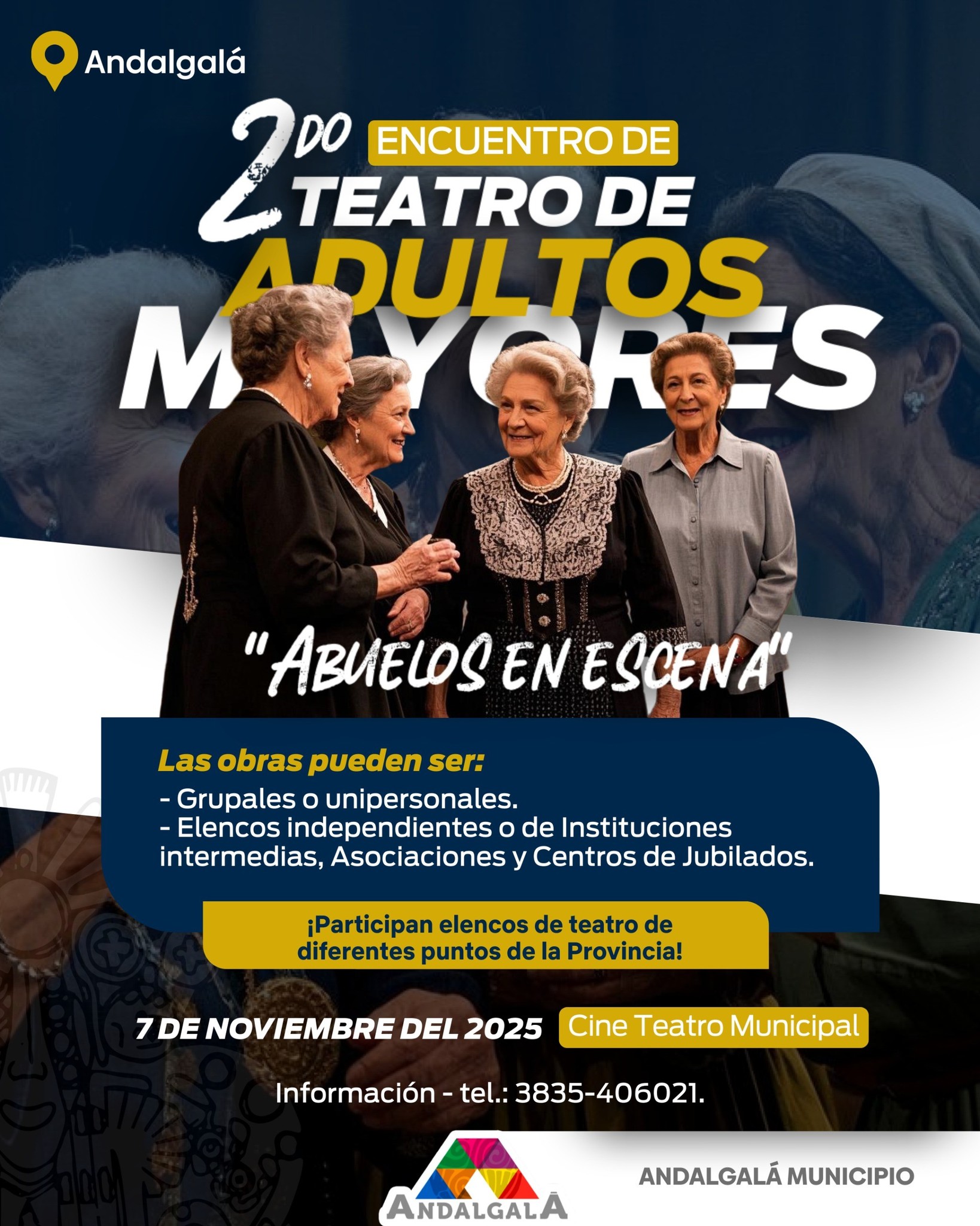 Este viernes, en Andalgalá tendrá lugar el 2do encuentro de teatro de adultos mayores “Abuelos en escena”, dará inicio a las 18:30 horas, en la sala del Cine Teatro Municipal.