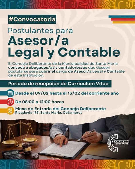 Mediante los Decretos Nro. 021/2026 y Nro. 022/2026 convocamos a abogados/as y contadores/as que tengan interés en postularse para cubrir el cargo de Asesor/a Legal y Contable.