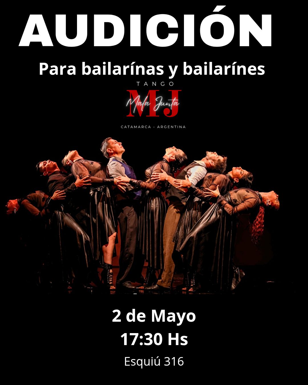La Compañía Mala Junta convoca a bailarinas y bailarines con cualquiera de éstas formaciónes: Tango, Danzas Folkóricas, Contemporánea, Clásico, urbano, entre otras, y un fuerte compromiso artístico para integrar la Compañía en sus próximas producciones. (Competencias, eventos, teatro, viajes) etc.