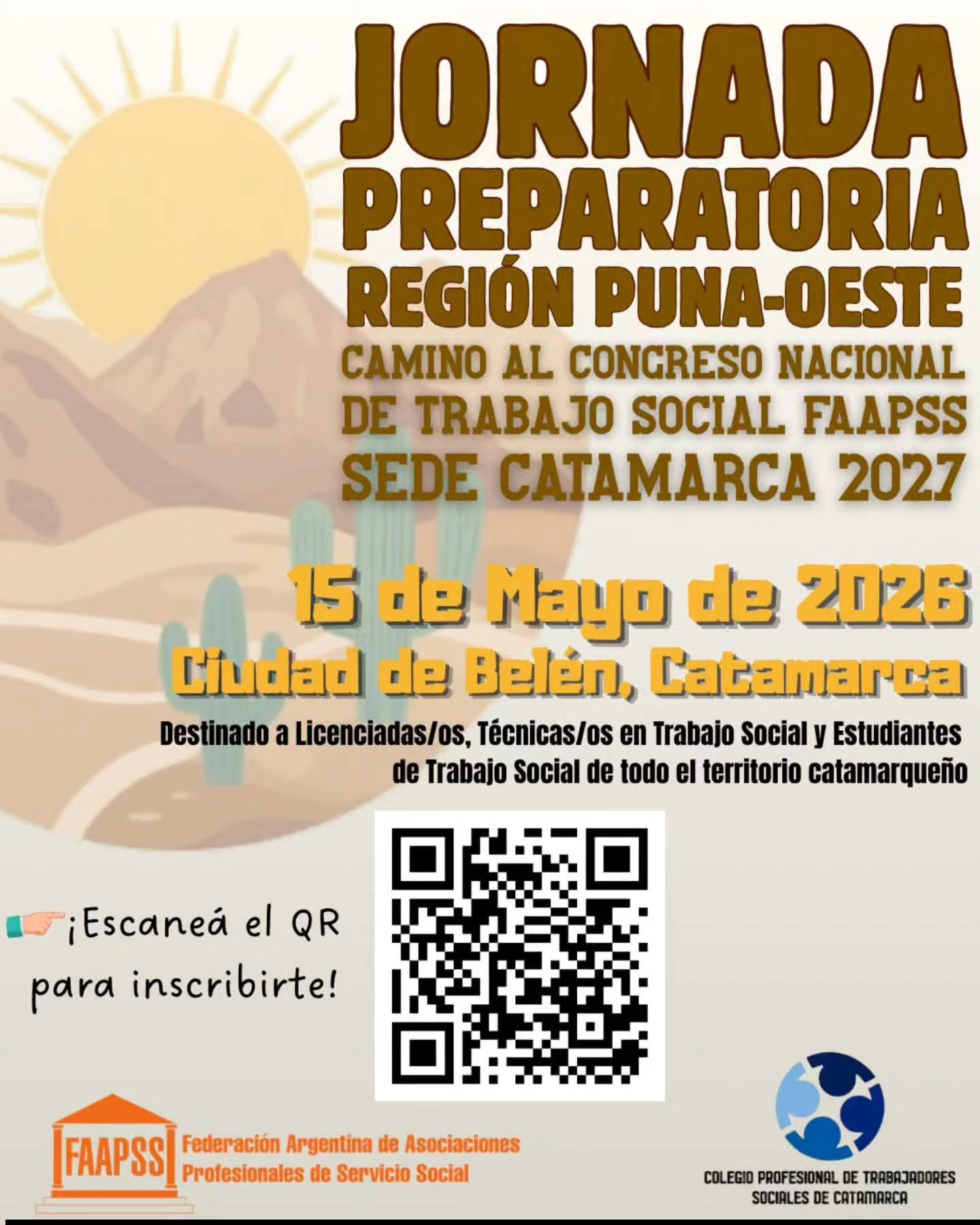 El evento tendrá lugar el 15 de mayo de 2026 en la Ciudad de Belén. Bajo la consigna de generar un espacio de encuentro y producción colectiva, la jornada busca que los aportes de la región Puna-Oeste tengan un rol protagónico en el máximo evento federal de la profesión que se celebrará el próximo año en nuestra provincia.