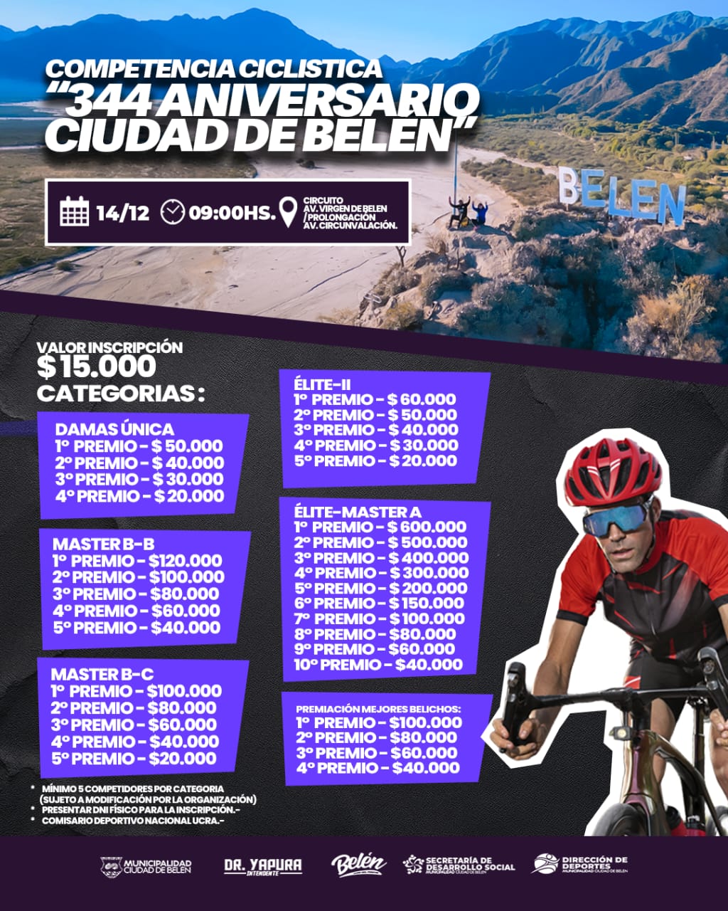 Este domingo 14 de diciembre, a partir de las 09:00 hs, se desarrollará la competencia ciclística en el marco del 344° aniversario de la ciudad de Belén. La cita será en el circuito de Av. Virgen de Belén, en la prolongación de Av. Circunvalación.