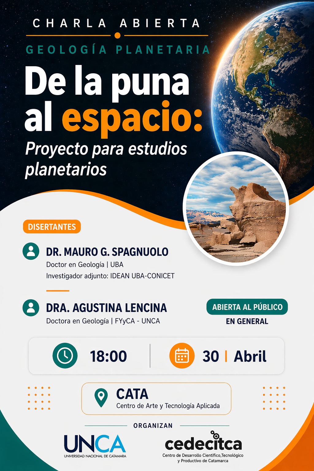 Bajo el título «De la puna al espacio: Proyecto para estudios planetarios», la actividad propone un recorrido apasionante que conecta el paisaje geológico único de la puna catamarqueña con la investigación científica aplicada a la exploración del sistema solar. La charla es de carácter público, de acceso libre y gratuito, y está especialmente ideada para todo público y en especial para despertar vocaciones científicas en jóvenes estudiantes.