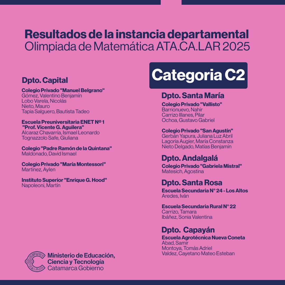 El Ministerio de Educación de Catamarca difundió los resultados de la instancia departamental de la Olimpiada de Matemática Ata.Ca.LaR 2025, destacando la participación de estudiantes de nivel primario y secundario de toda la provincia.