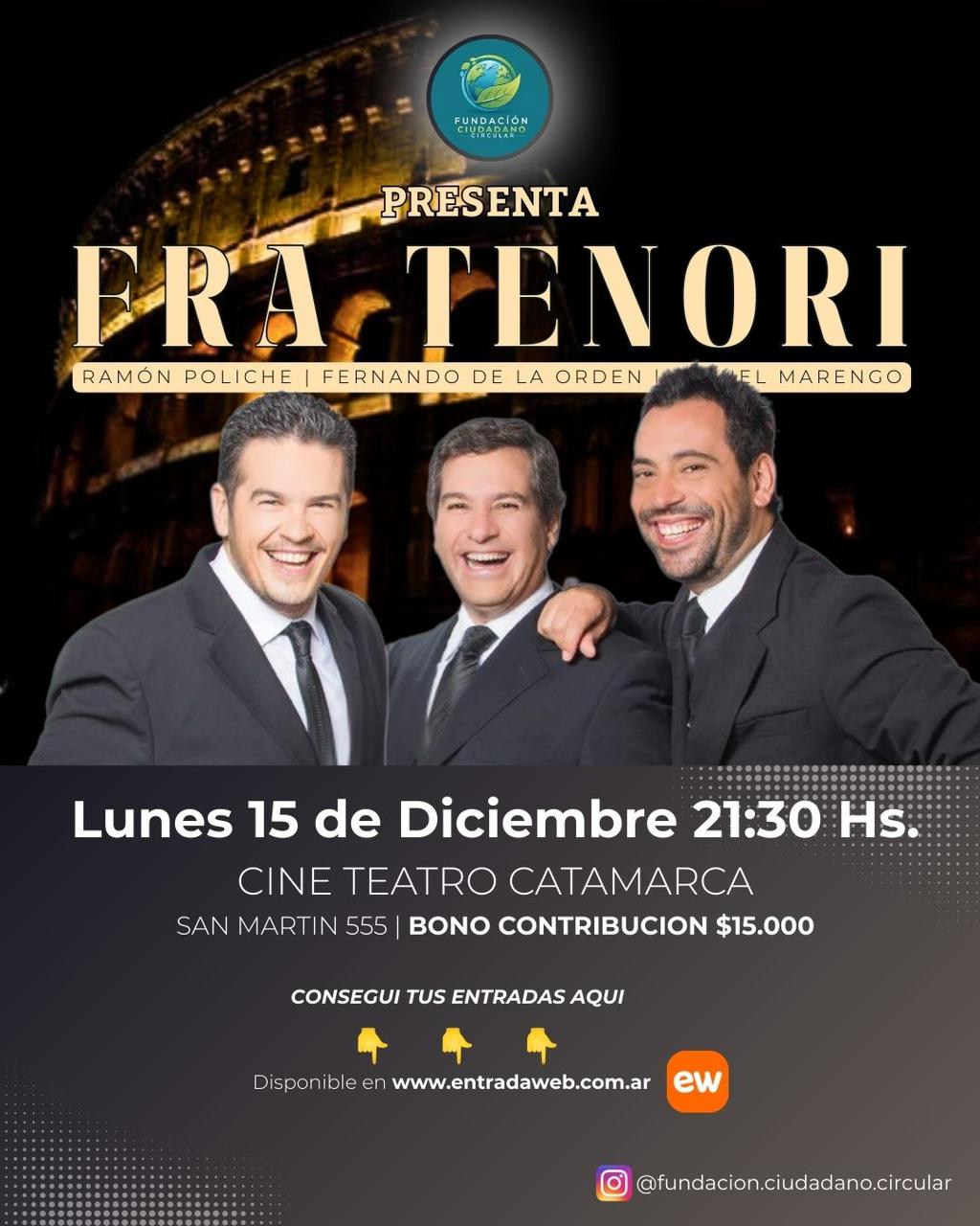 El prestigioso grupo Fra Tenori, integrado por tres destacados intérpretes de la escena lírica y popular argentina, se presentará en el Cine Teatro de Catamarca con un espectáculo que promete recorrer desde la ópera hasta la música popular con una fuerza vocal única.