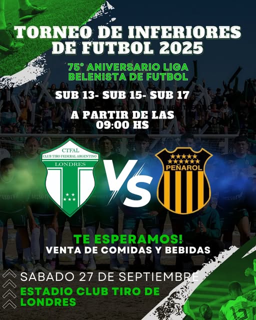 Este sábado 27 de septiembre, el Estadio del Club Tiro de Londres será escenario de una gran jornada futbolera con el regreso de las divisiones inferiores. La actividad, enmarcada en los festejos por el 75° aniversario de la Liga Belenista de Fútbol, convocará a jóvenes talentos de toda la región.