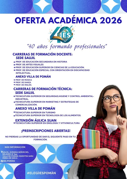 El Instituto de Estudios Superiores Pomán informa la Oferta Académica autorizada para el Ciclo Lectivo 2026.
