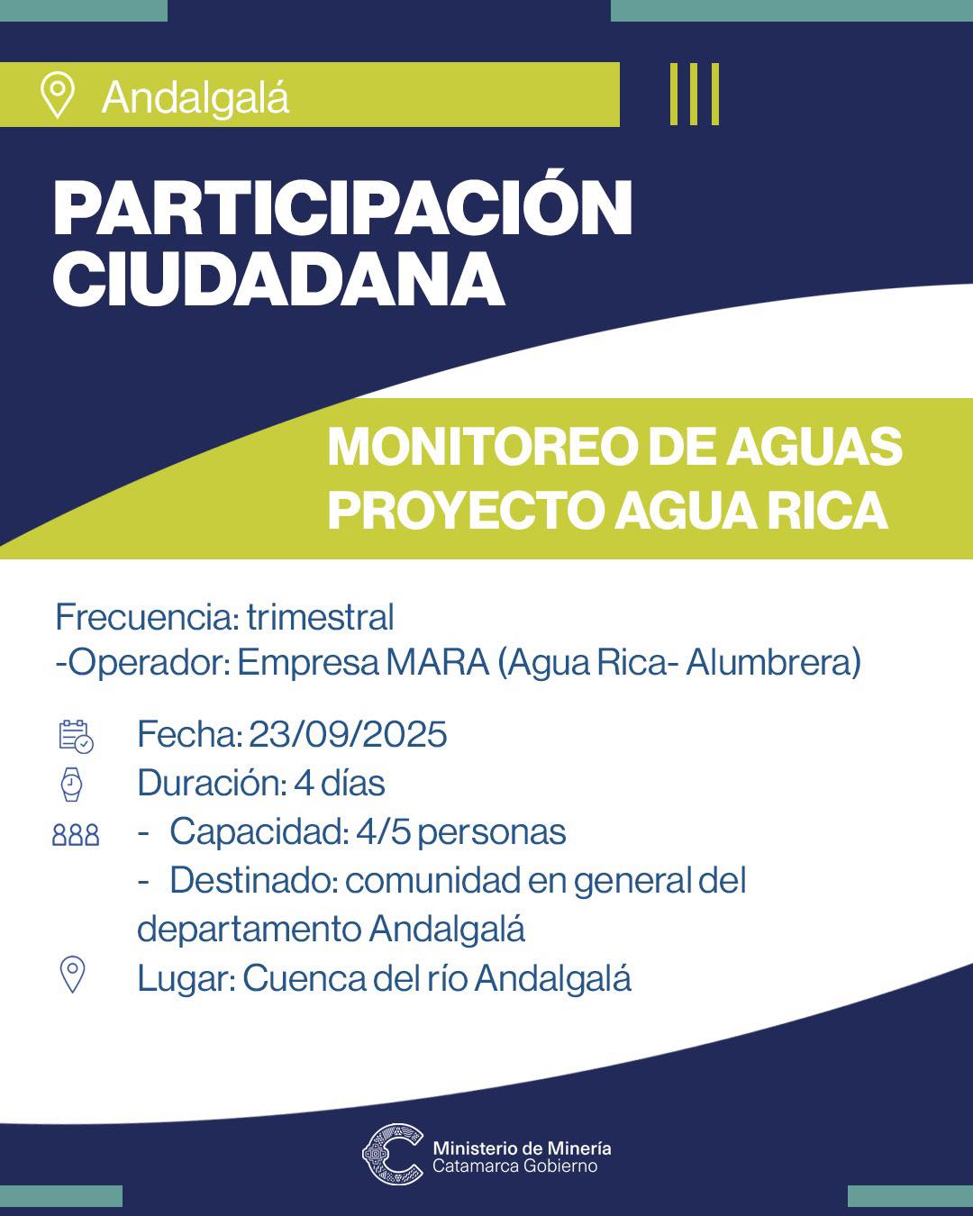 El próximo miércoles 23 de septiembre 2025, se realiza en el departamento Andalgala ( Cuenca del rio Andalgala) el monitoreo de aguas del Proyecto Agua Rica .