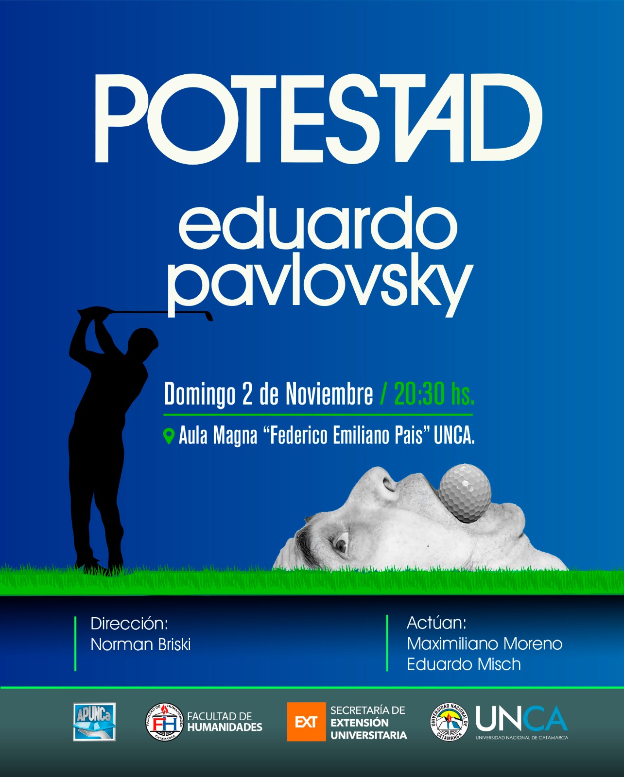 El próximo domingo 2 de noviembre a las 20,30 horas, se presentará en el Aula Magna “Federico Emiliano Pais” de la Universidad Nacional de Catamarca la obra “Potestad”, escrita por el reconocido dramaturgo Eduardo “Tato” Pavlovsky y dirigida por Norman Briski.