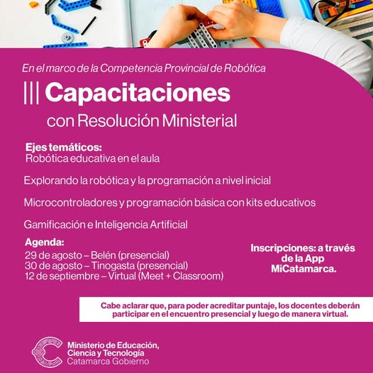 En el marco de la Competencia Provincial de Robótica, invitamos a las y los docentes de todos los niveles y áreas a participar de las capacitaciones con Resolución Ministerial, que se desarrollarán en modalidad híbrida.
