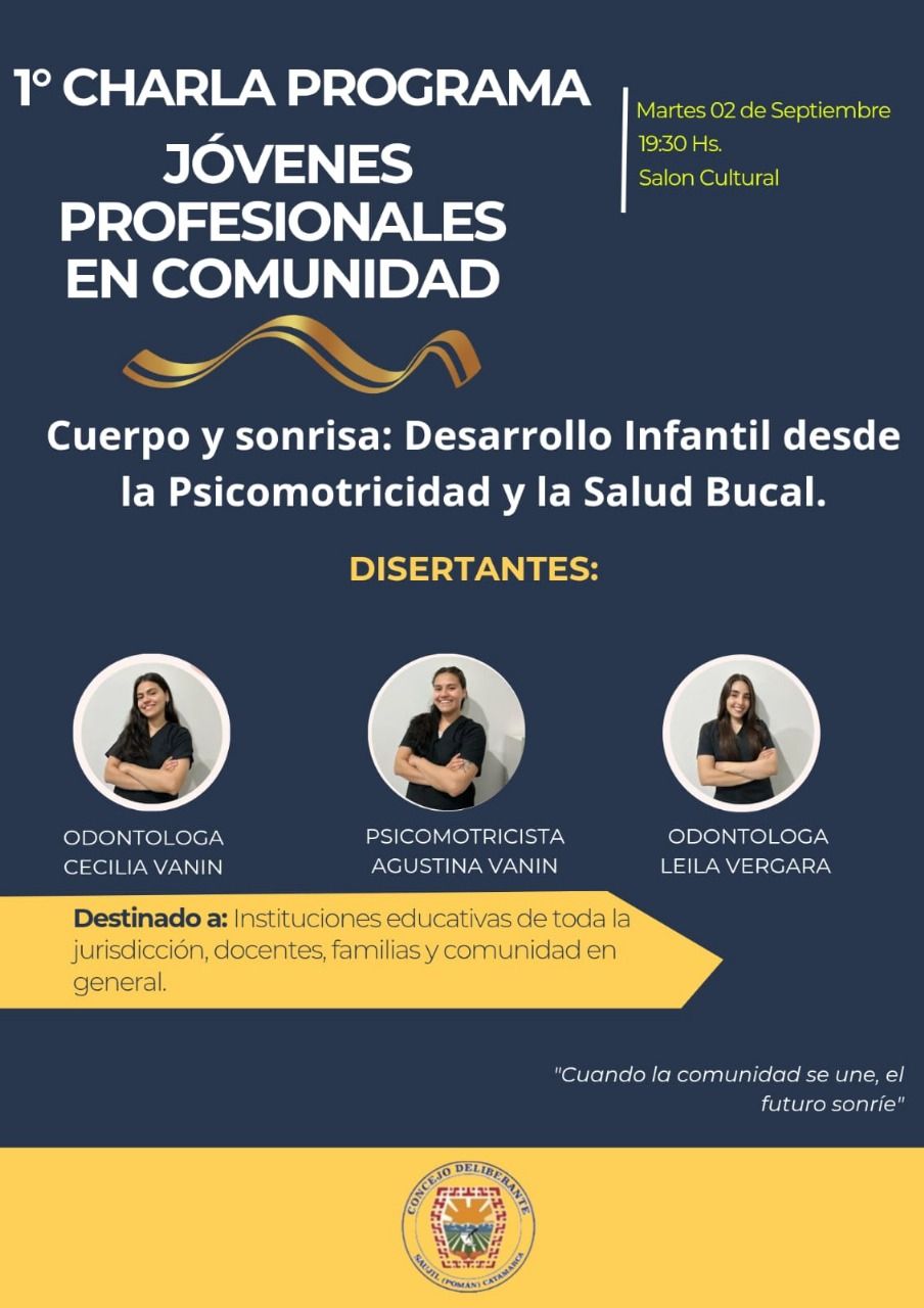 Mañana martes 2 de septiembre a las 19:30 horas, en el Salón Cultural de Saujil, se llevará a cabo la 1° Charla del Programa «Jóvenes Profesionales en Comunidad», una iniciativa del Concejo Deliberante de la Municipalidad de Saujil que busca generar espacios de participación, visibilización y divulgación para los nuevos profesionales de la comunidad.