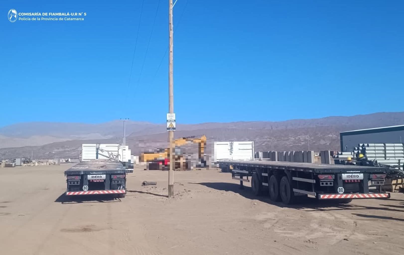 En una mina ubicada en la Ruta Nacional N° 60, a la altura del Kilómetro N° 1.300, de la localidad de Fiambalá, Departamento Tinogasta, los policías incautaron dos (02) semirremolques marca Idero, por el supuesto delito de estafa, en virtud de lo cual fueron puestos a disposición de la Justicia interviniente, desde donde se impartieron las medidas a cumplimentar.