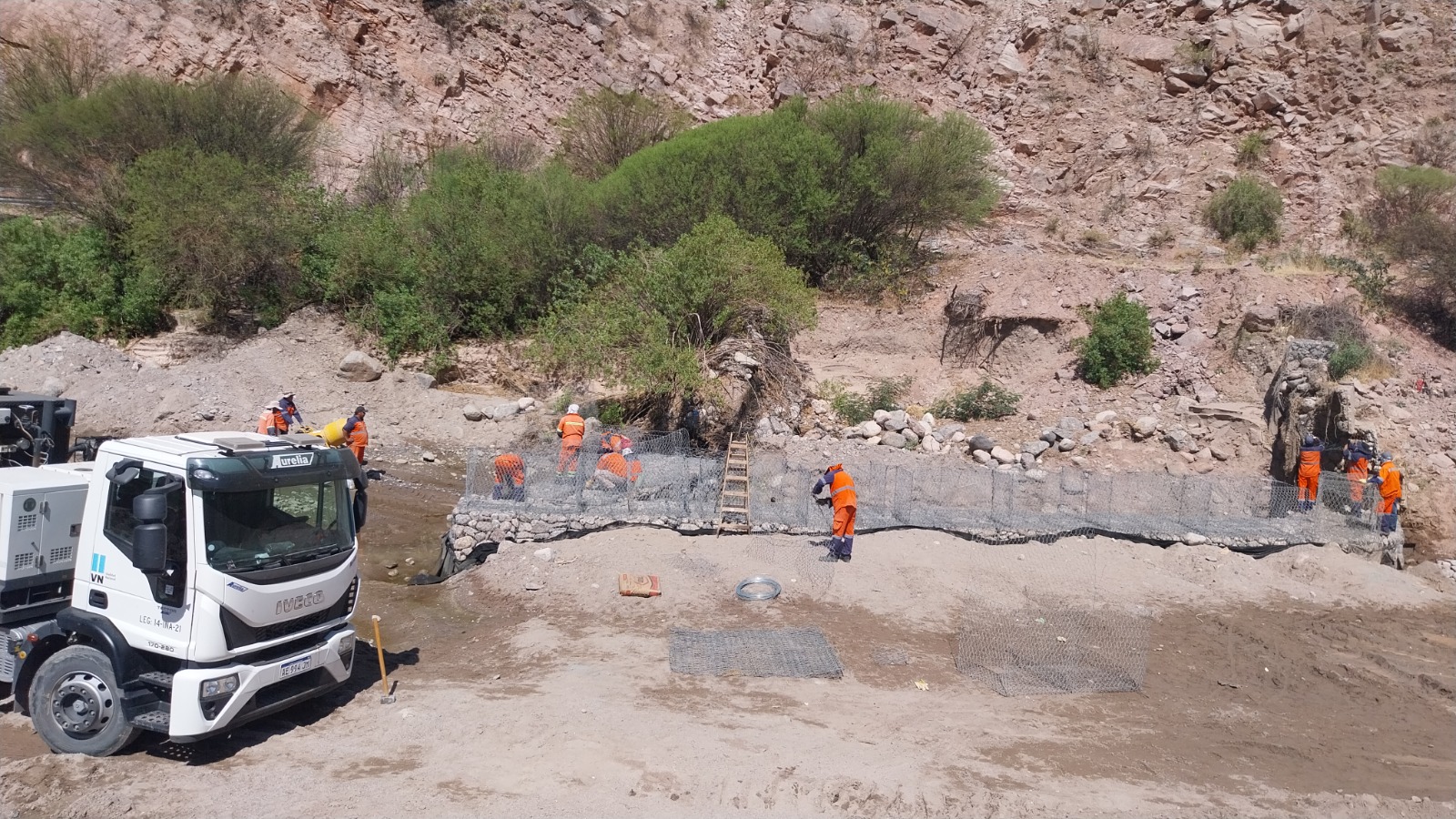 Los trabajos, que son ejecutados por personal y equipos afectados a la Sobrestantía de Zona, consisten en el armado de gaviones y colchonetas de piedra embolsada con tejido metálico, además de la limpieza del cauce del río.